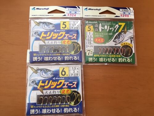 雨降り後で潮も濁り、明日は晴れで 風も無く、中潮、満潮7:27/18:20、 干潮0:34/12:53なら丁度、14時位か ら潮も動き出すはず。 かみさんも行くと言うので、19時で 仕事も終わらせて帰りにアミコマセ とトリック仕掛け5号を購入。 前回はコマセ2キロを購入…