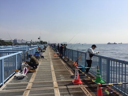 勤務先はメーデーで休み。連休中の 平日で芋洗いの大黒海釣り公園も、 今日なら空いているはず。 午前3時半起床、準備をすませて、 最寄駅までカートをゴロゴロ。 かみさんも参戦。 「シリヤケイカ釣りたい、アジを釣 りたい」と興奮気味。 始発電車で横浜駅…