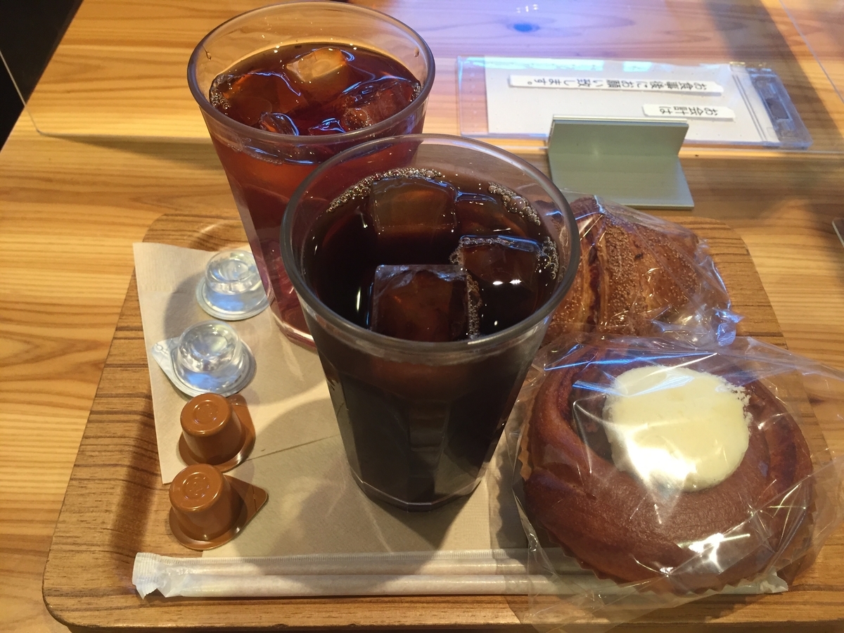 アイスコーヒーとシナモンブレッドを注文。席は自分で確保するスタイル。面白いのは後払い形式。