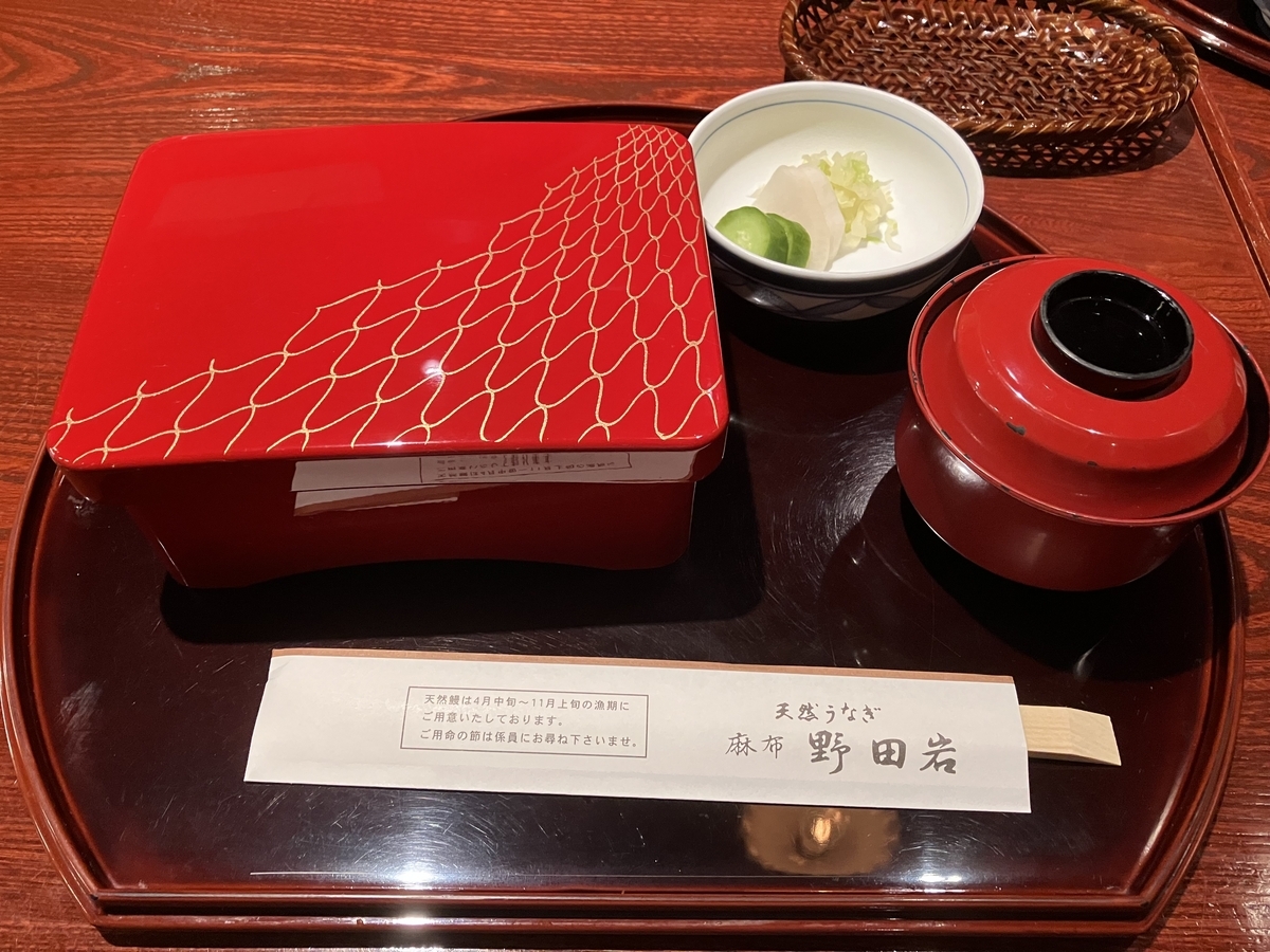 鰻重の松を注文。鰻重は梅、竹、松とかでランク付けするけど、野田岩は竹、松、楓、椿の順番。最高級は「かさね」