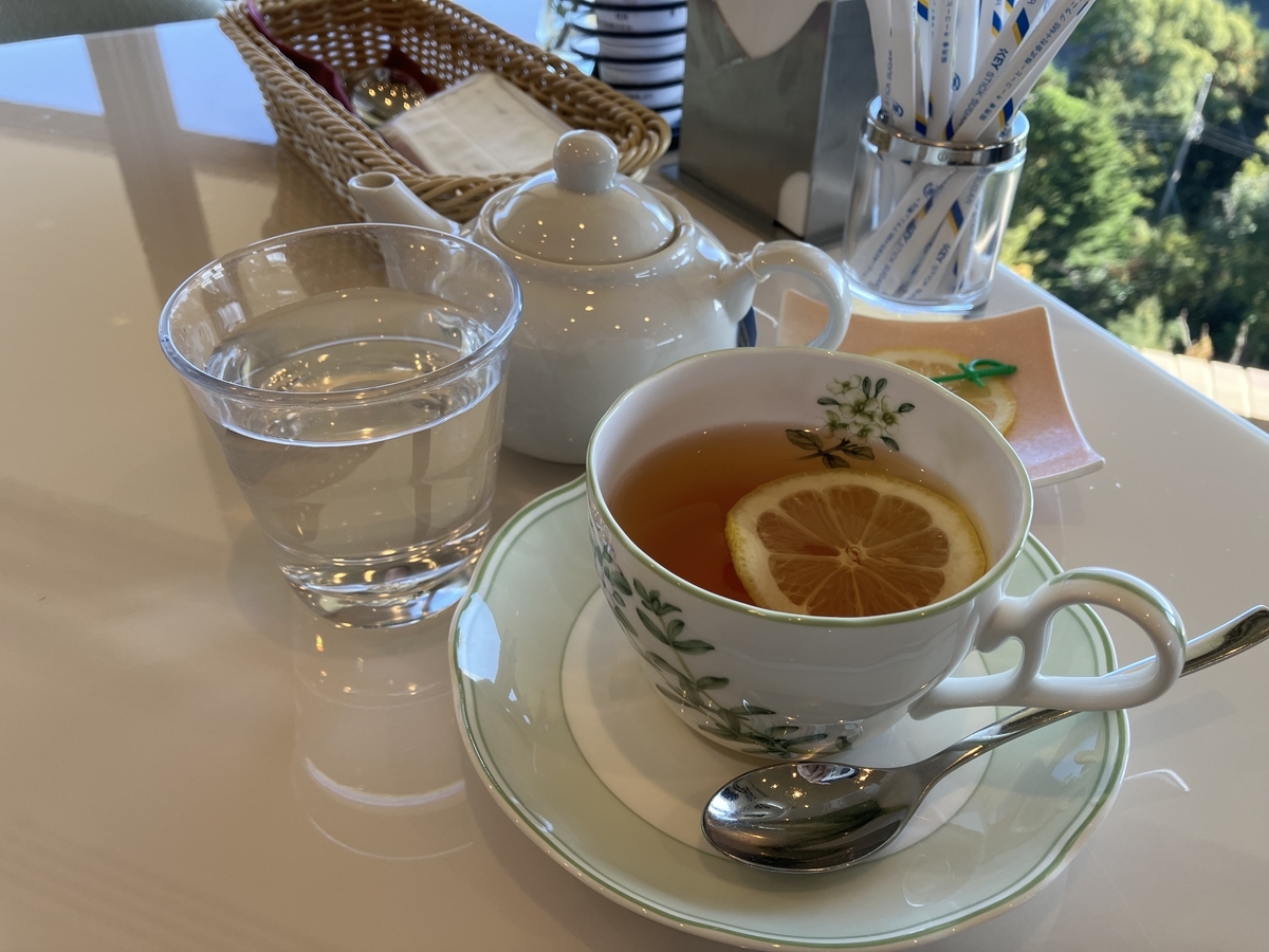 窓際の海が見える席に着席。先に運ばれて来た紅茶を飲みながら一息。こちらが、注文したクロワッサンサンド🥐
