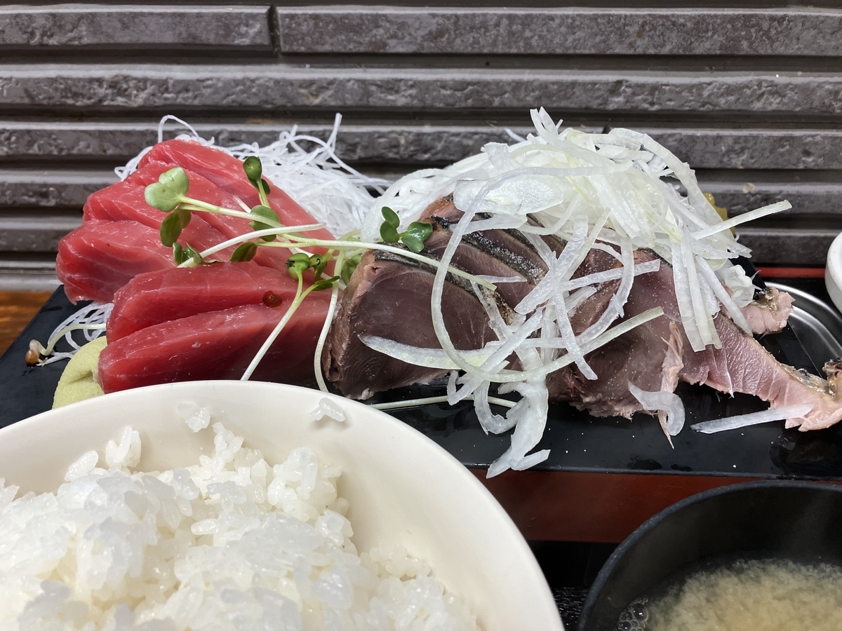 刺身2点盛り定食は、マグロ&塩カツオで注文。惣菜は温泉卵、蕎麦、香の物。先払いで注文。(支払いは現金のみです)